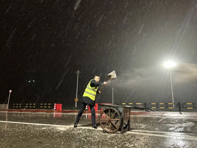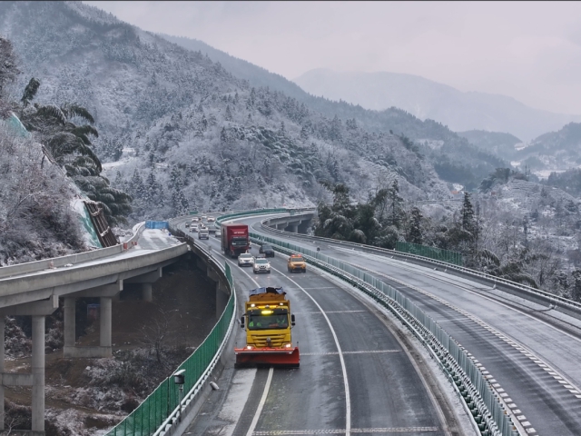 相關(guān)路段營運(yùn)單位第一時間啟動除雪保通應(yīng)急預(yù)案,與高速交警、路政等部門協(xié)同駐防路面重點部位,及時做好車輛疏導(dǎo)、交通管控、救援和事故處置等工作,盡最大努力降低雨雪天氣給道路通行帶來的影響。受寒潮天氣影響較重的山區(qū)路段迅速調(diào)配應(yīng)急人員、除雪設(shè)備及物資,針對山區(qū)路段的長大橋梁、隧道出入口、陡坡彎道等關(guān)鍵節(jié)點進(jìn)行重點布控,設(shè)置連續(xù)警示提醒標(biāo)志,采取“小循環(huán)多頻次”模式開展融雪劑撒布作業(yè)。其中,淮河特大橋、桃墅嶺隧道等易結(jié)冰路段還首次啟用除雪融冰噴淋系統(tǒng),防止橋面夜間上凍結(jié)冰。